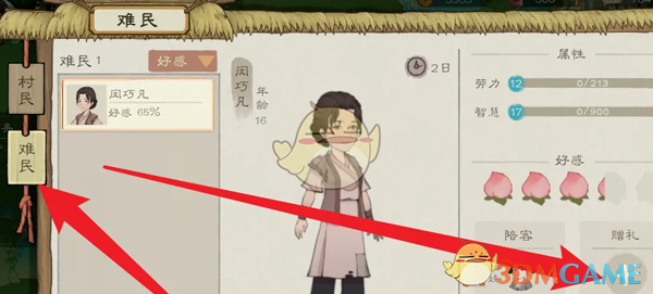 2、在村民页内,点击难民,然后找到右侧的赠礼选项;