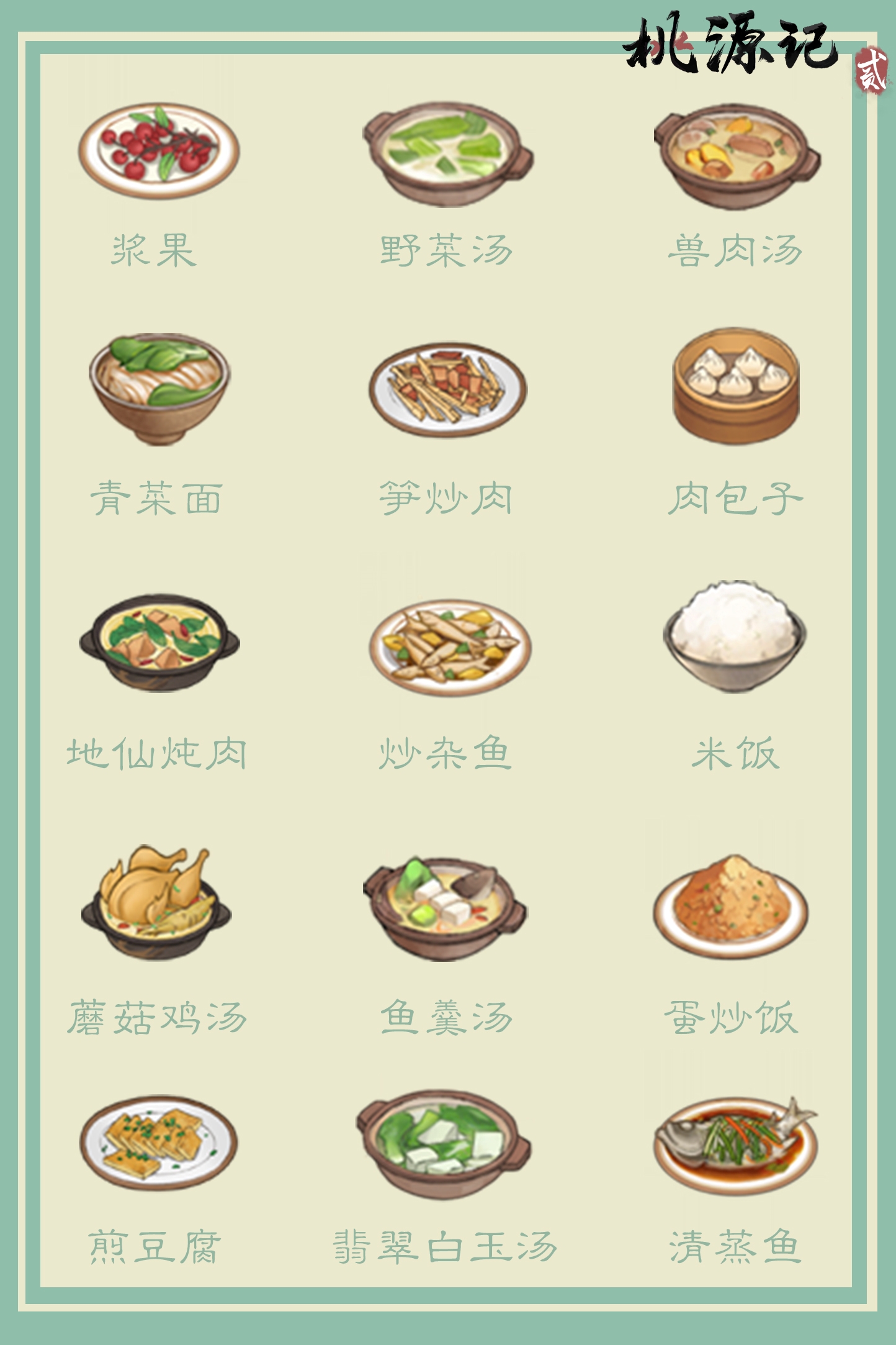 桃源记2都有什么菜,游戏中有不同菜品拥有不同营养和饱食度,桃谷里的菜品多种多样,玩家们有没有收集齐呢,接下来跟随小编一起来看看游戏里都有哪些美味佳肴吧,看看还有没有你没有收集到的菜品。