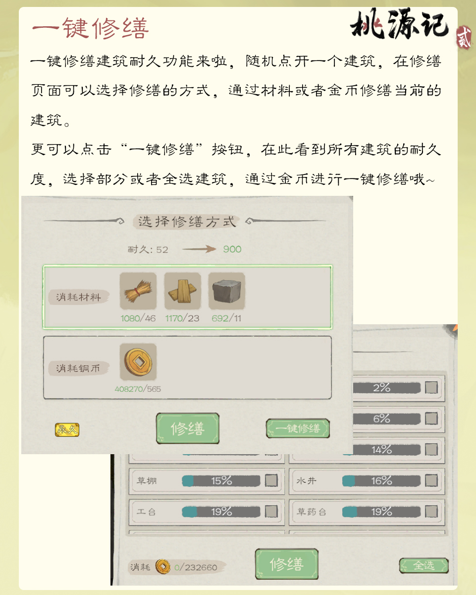 桃源记2离线功能什么时候上线,游戏以陶渊明《桃花源记》为灵感,打造沉浸式古风生存建造手游。玩家将带领村民遁入山谷,从零开始拓荒求生,为了提升玩家们的游戏体验,近期将上线一键修缮功能、离线功能以及村民居所分配和婚配功能,一起来期待下吧。