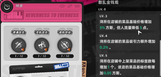 散乱金钱观这个特技分了好几个等级,每个等级带来的效果都不太一样。先说LV.3这个等级,当浔待在某个店铺的时候,那个店里卖的菜品价格会直接涨5%。听起来好像挺不错对吧,菜价高了赚的钱自然就多。不过事情没那么简单,这个涨价是有代价的,店铺的人流量会掉5点。人少了,就算单价高也不一定能赚到更多钱,所以这个等级的效果,得看你店铺本身的情况来定。