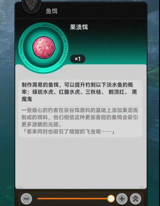 然后是杂谷饵这个东西。这种鱼饵的制作材料,主要就是稻谷加上蚯蚓混在一起揉成的,配方听起来挺朴素的。用它来钓鱼的话,会明显提高钓到黑纹水虎、活翡翠、水下彩、牙巴拉,还有鹤顶红这几种淡水鱼的概率。基本上每个刚学钓鱼的玩家,都会先接触到这种饵料,因为它制作起来比较简单,材料也容易弄到手。如果你现在就是想,专门针对这几种淡水鱼类去钓的话,那杂谷饵肯定是比较合适的选择。