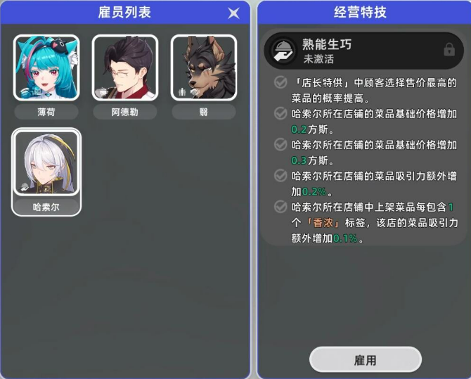 刚把店铺开起来,第一件事就是要把基础功能给解锁了。进到管理界面之后,右边有个技能树的按钮,点进去能看到不少可以激活的东西。这里面小编觉得最值得先点的,就是哈索尔那个熟能生巧的技能。这技能有个好处,就是你每做一次咖啡或者菜品,都会累积一点被动加成,时间长了员工做出来的东西售价就能往上涨。至于招财猫那个功能,虽然看起来挺吸引人,但其实需要店铺等级达到3级,还得有10次五星好评才能开,前期资源本来就紧张,没必要急着解锁。