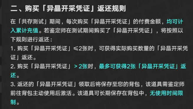 通行证的返还规则稍微有点复杂。游戏里叫异晶开采凭证,其实就是其他游戏的战令或者通行证。测试期间买这个凭证的钱,首先会按照上面说的异晶返还规则给你返异晶。除此之外,买凭证本身还有额外的返还。如果你买的凭证数量不超过2张,公测后会按实际购买数量返还凭证。要是买了超过2张,最多只返2张。返还的凭证会以道具形式发到背包里,需要自己去背包手动使用才能激活,而且这个道具没有使用期限,什么时候用都行。