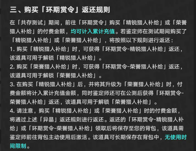 环期赏令也就是战令系统,分精锐猎人补给和荣誉猎人补给两种。测试期间买了哪种,公测后就会返还对应的解锁道具。买精锐的返精锐解锁道具,买荣誉的返荣誉解锁道具。如果你先买了精锐版,后来又升级成荣誉版,那公测后会直接给你荣誉版的解锁道具。同样的,买战令的钱也会按异晶返还规则再给你一遍异晶,返还的战令道具也是放在背包里需要自己激活。