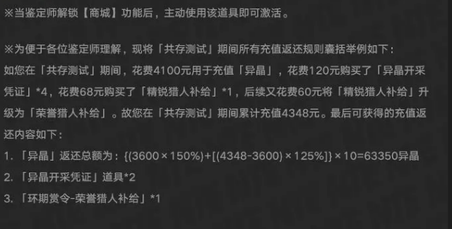 举个例子能看得更清楚。假设测试期间你充了4100块买异晶,花120块买了4张通行证,花68块买了精锐战令,又花60块升级成荣誉战令。总共花了4348块。公测后能拿到的东西是这样算的,前3600块返还54000异晶,剩下748块返还9350异晶,异晶总共63350个。通行证虽然买了4张但只返2张道具。战令因为升级成荣誉了,所以直接返1个荣誉战令解锁道具。
