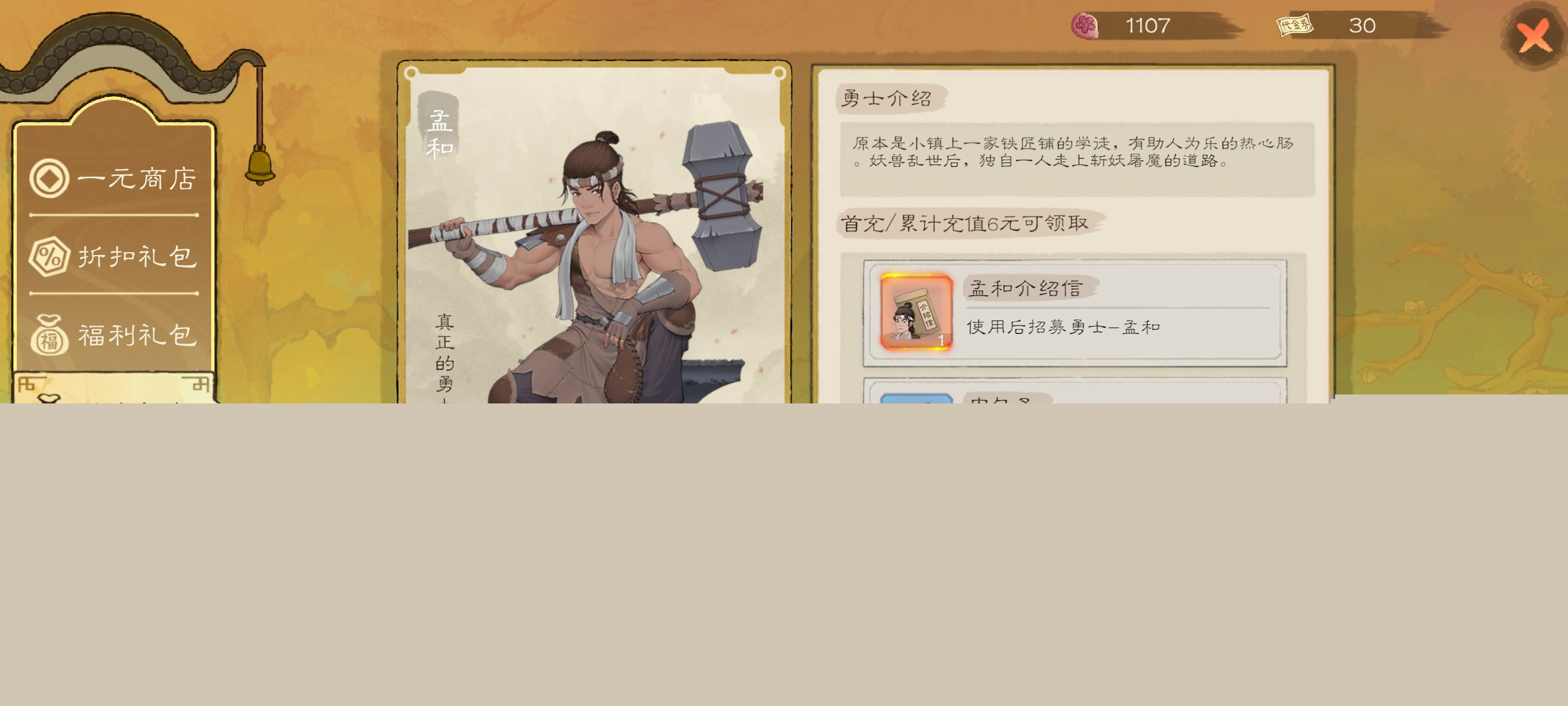 充满六元之后会送你孟和,以及肉包子配方,性价比很高,孟和这个人物是很强的,前中后期都可以当主力来培养抵抗妖兽