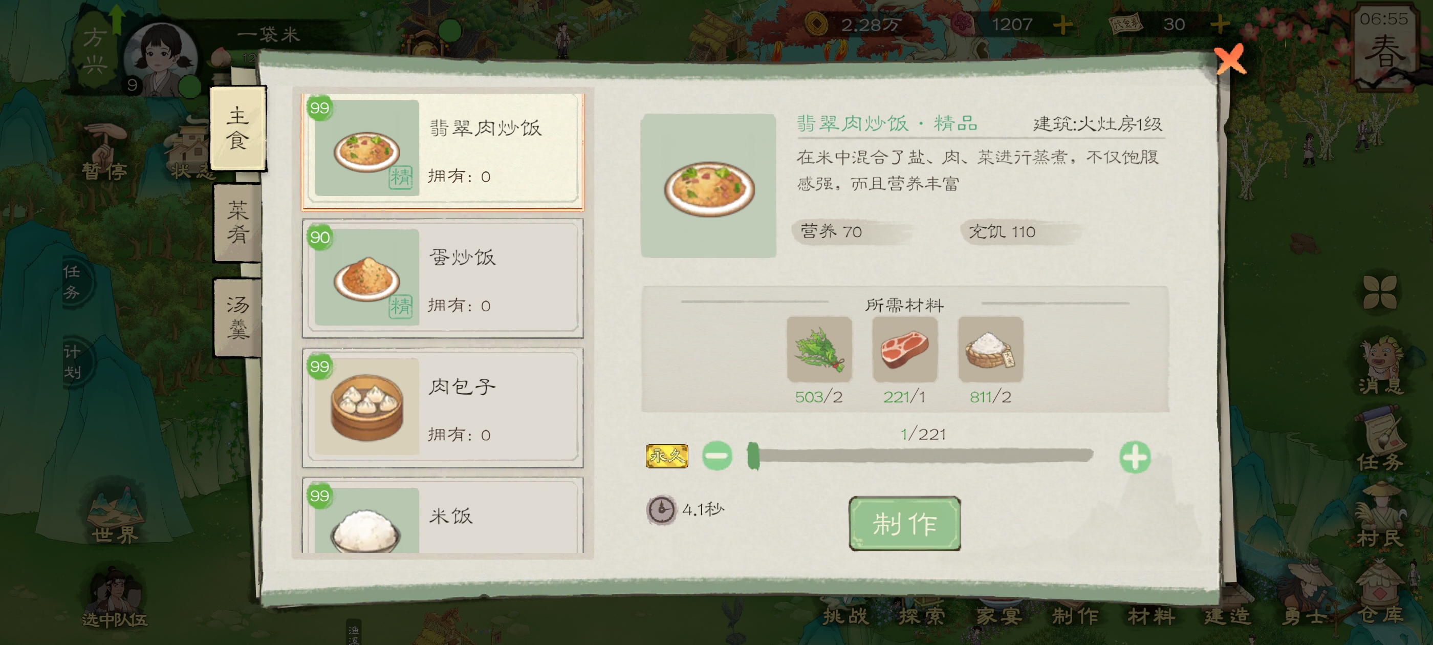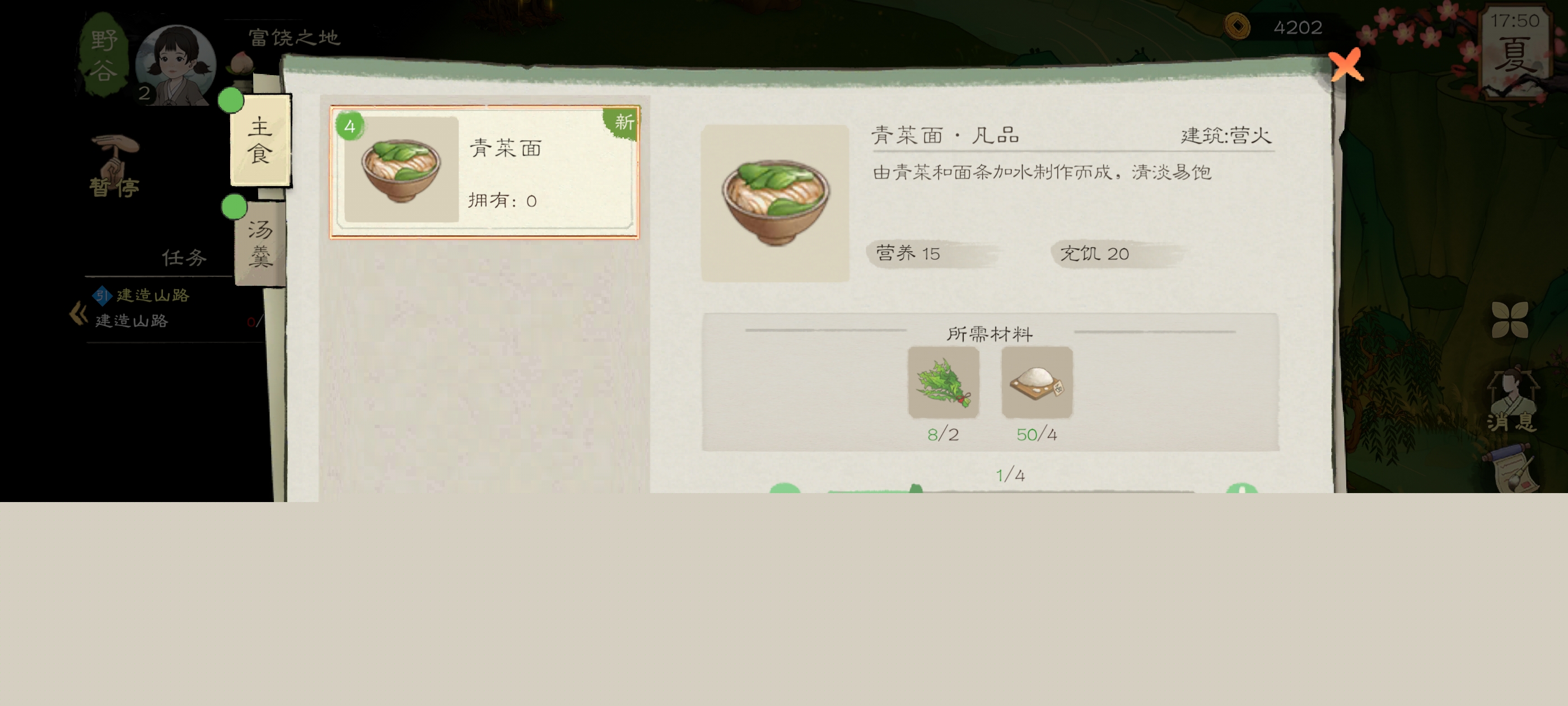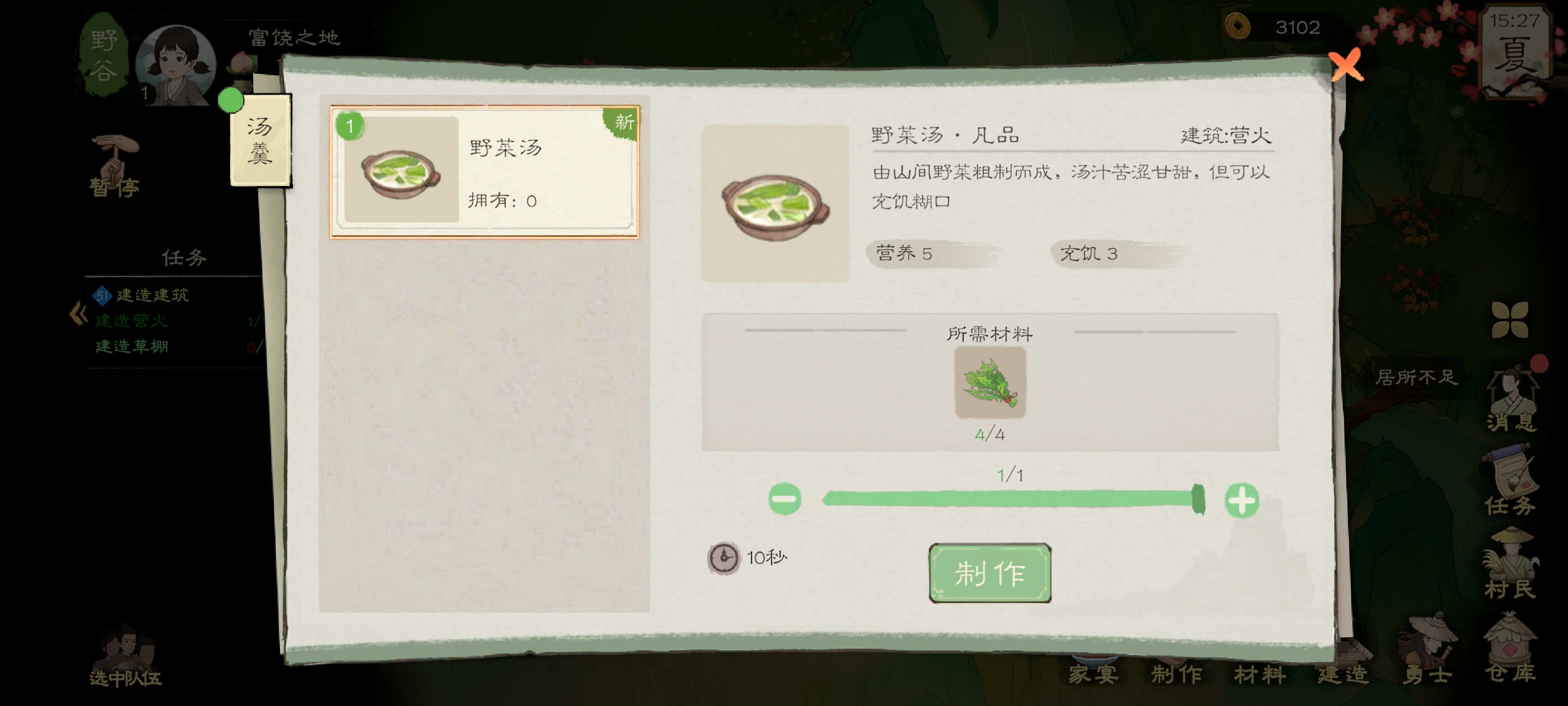 我们这里直接制作野菜面,野菜汤的话,太亏了,要的食物多,加成还少,具体价值大家可以看图,上面的营养与充饥