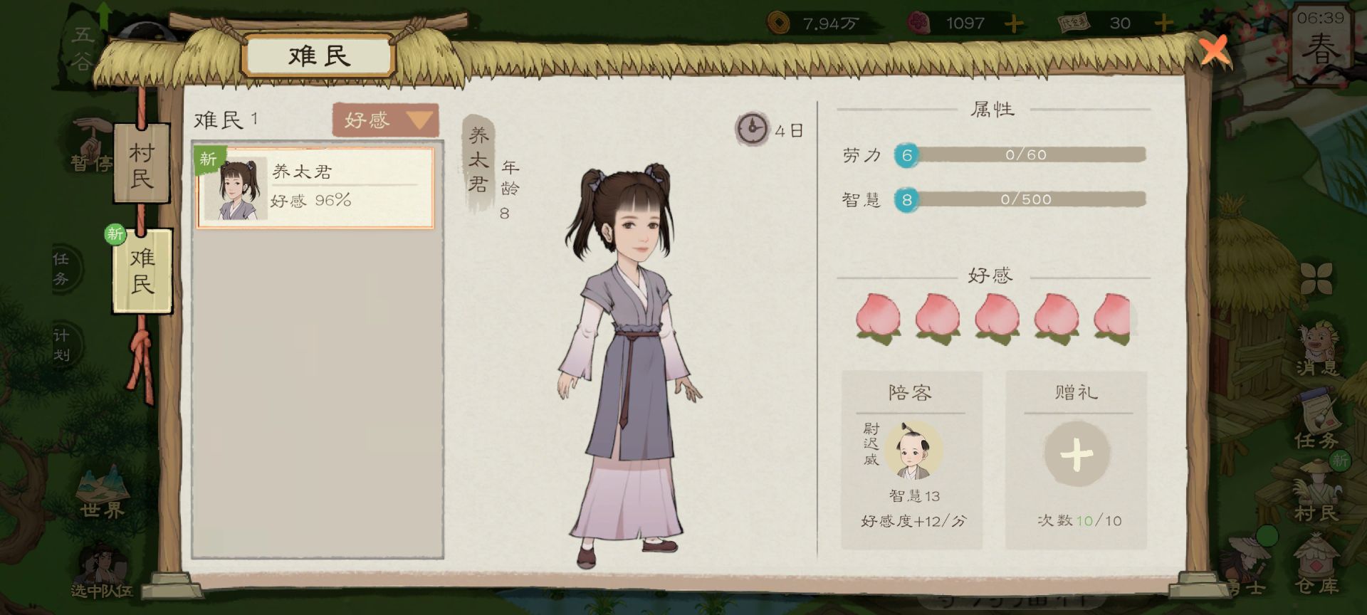还有就是前期如果有人敲门要加入的话,是一定要同意,让他加入,因为前期人力也是一个重要资源,你有小孩的话,直接给他小孩陪玩,快速增加好感度,不要用食物来增加好感度,因为前期食物较少,而且给的东西比较差,他好感加的也少,慢慢等它好感自动添满加进来成为村民