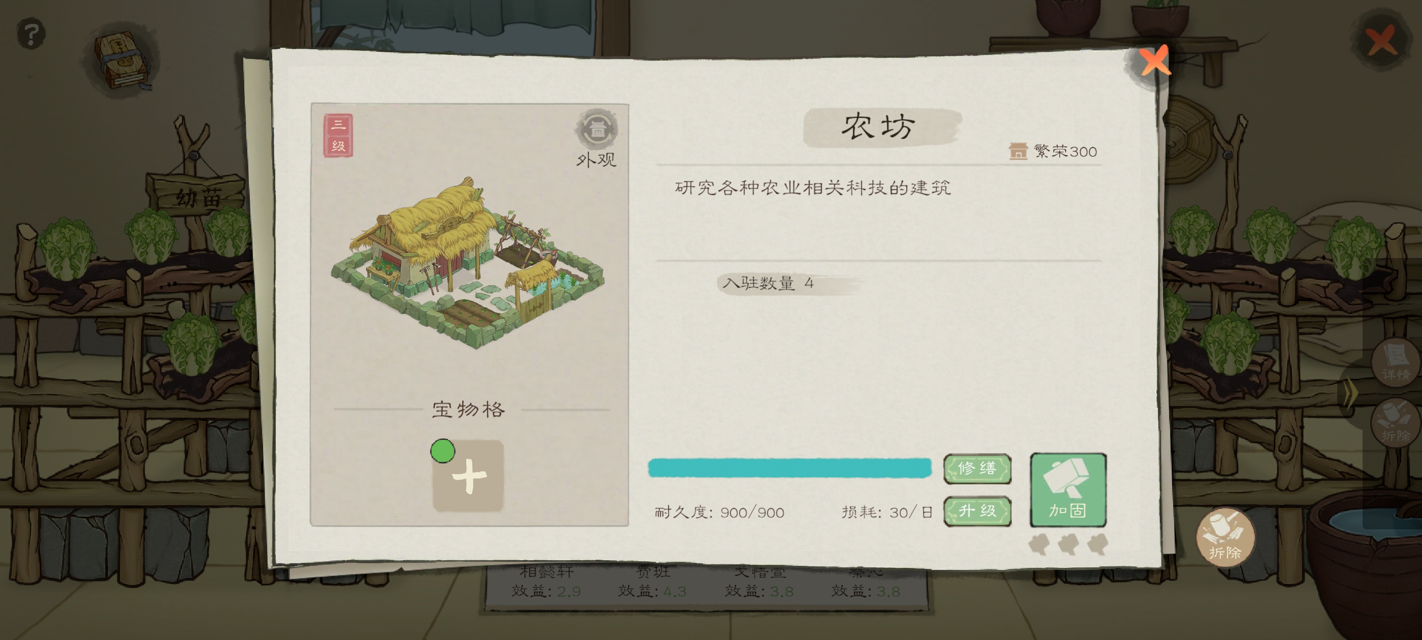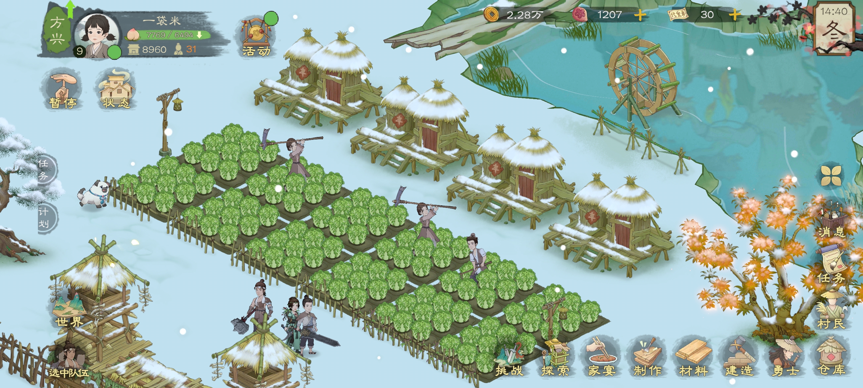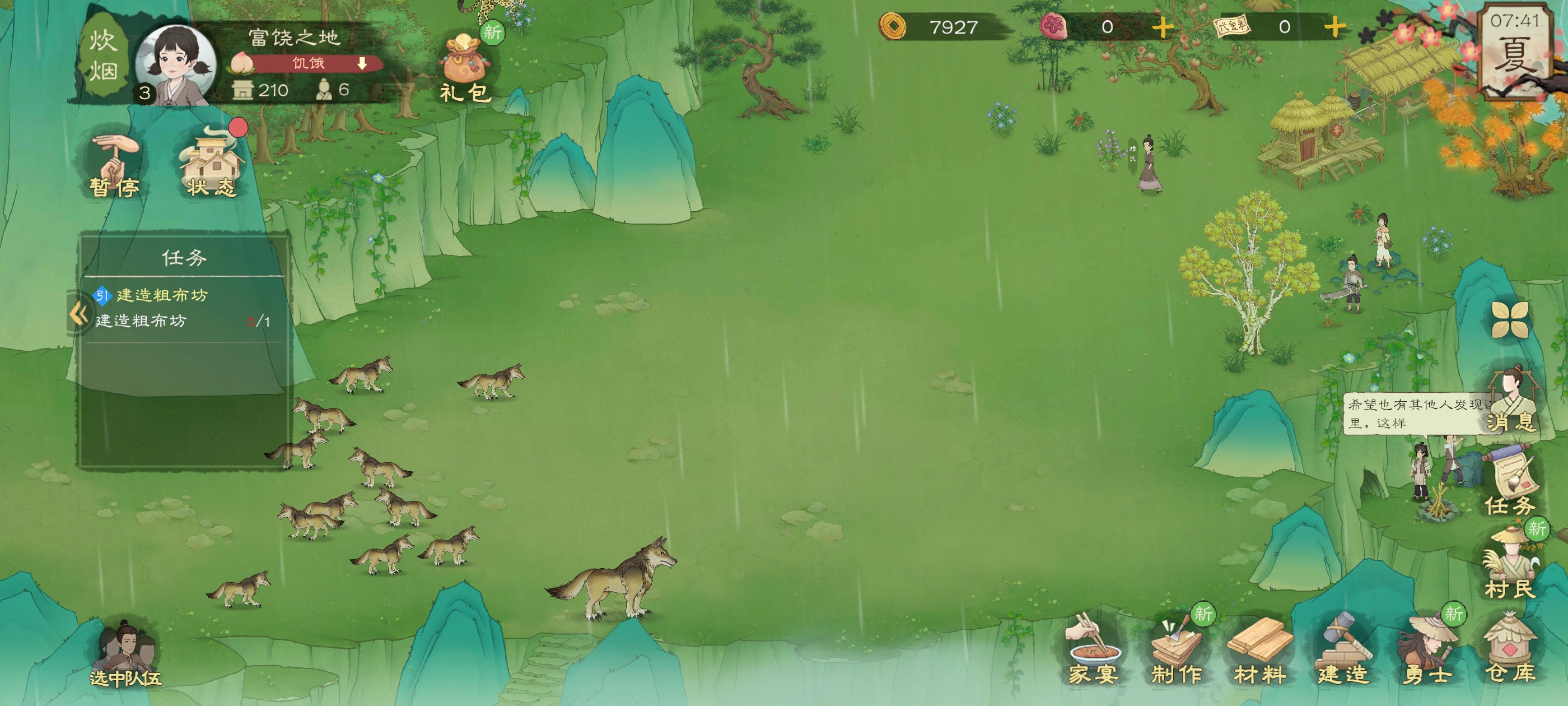 后面解锁水车,鱼塘,鸡舍,新地图森林啥的,里面都可以获取大量的食物,其中水车是可以增加种田产量的,