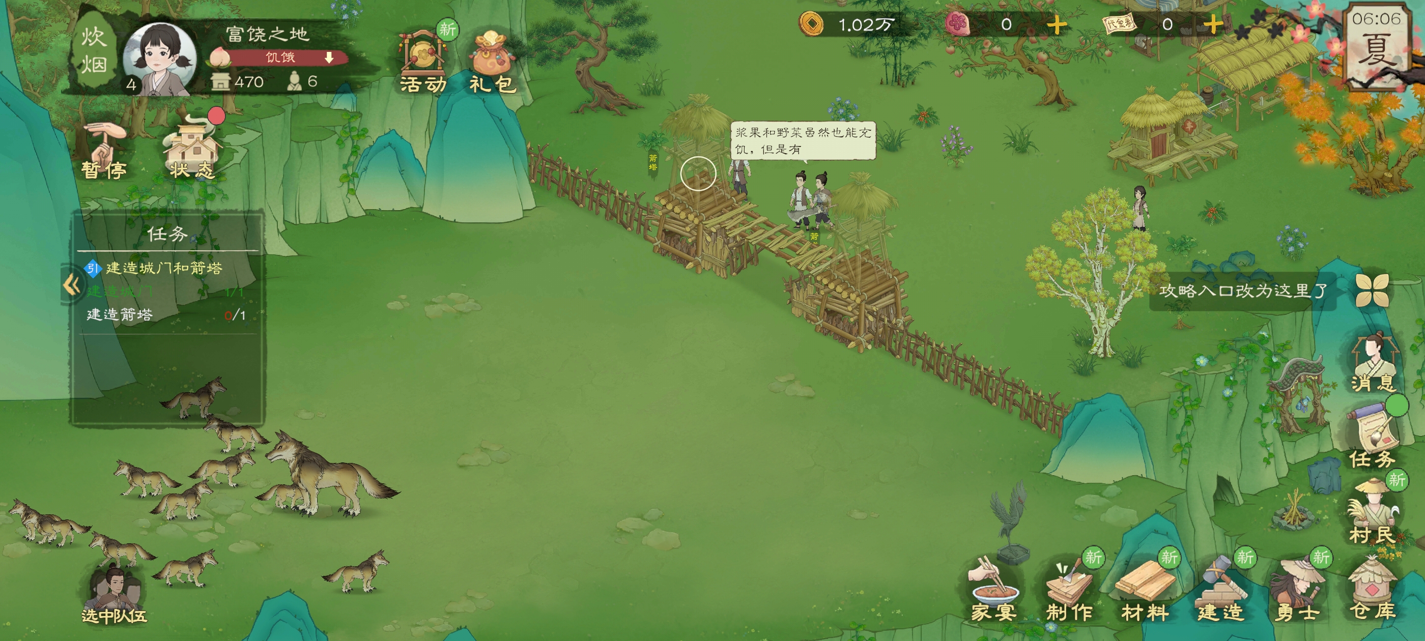 这时候我们就不要让勇士打,因为去了也打不过,纯属浪费时间,先苟着发育,等到四级,会解锁城墙和箭塔,建好之后,用来打配合,可以轻松过的