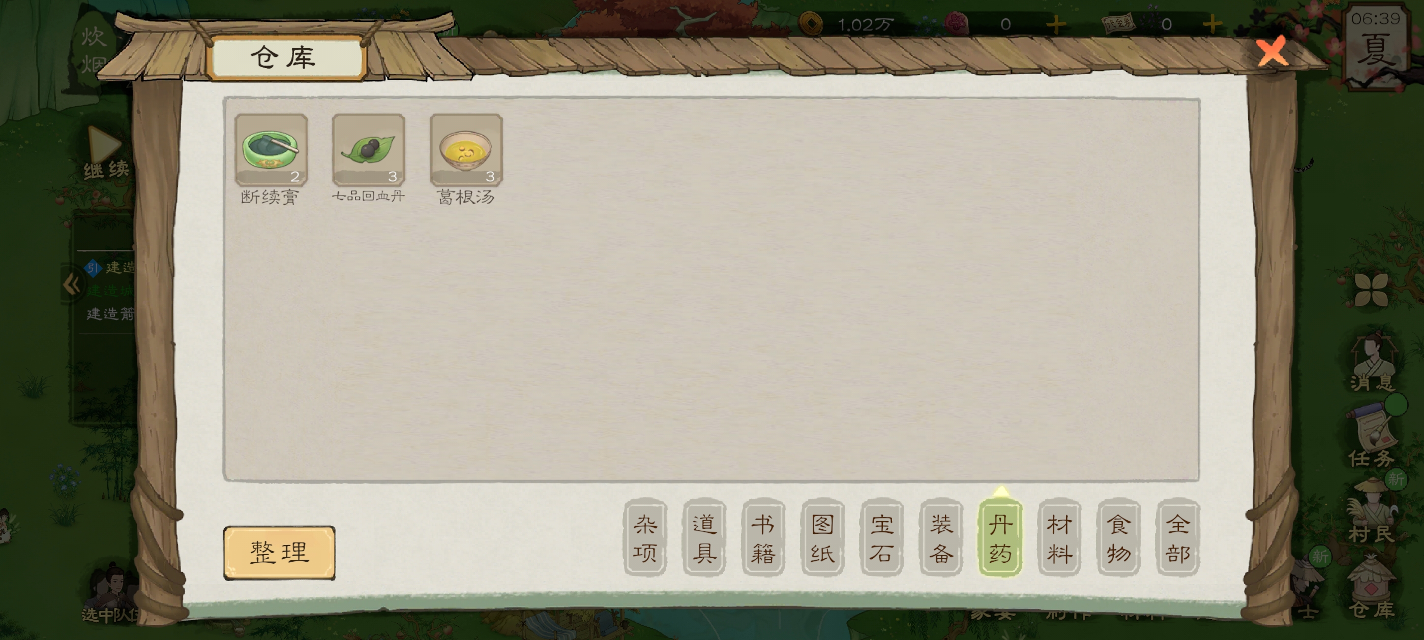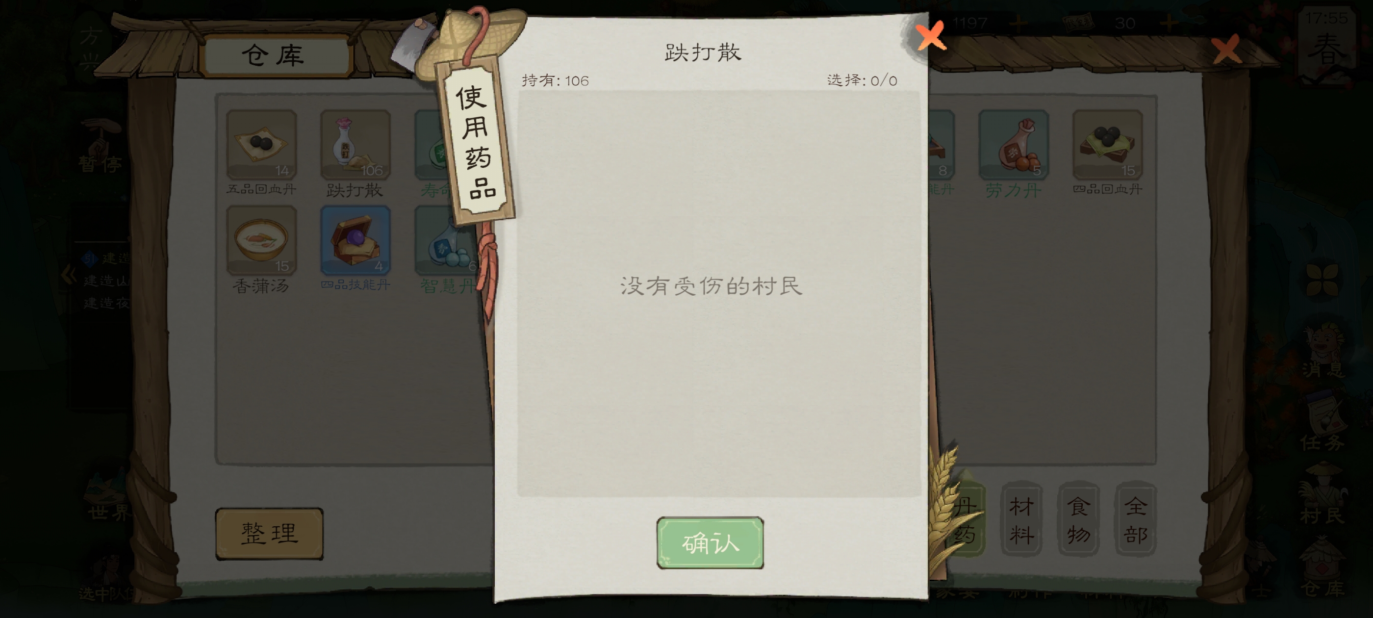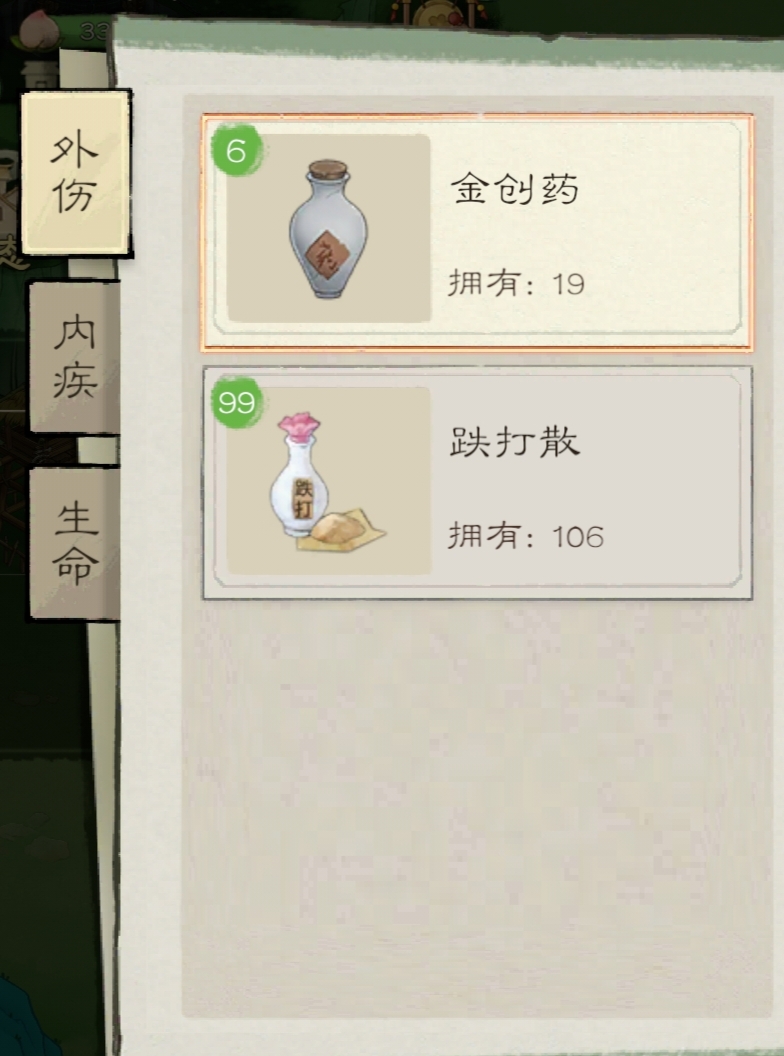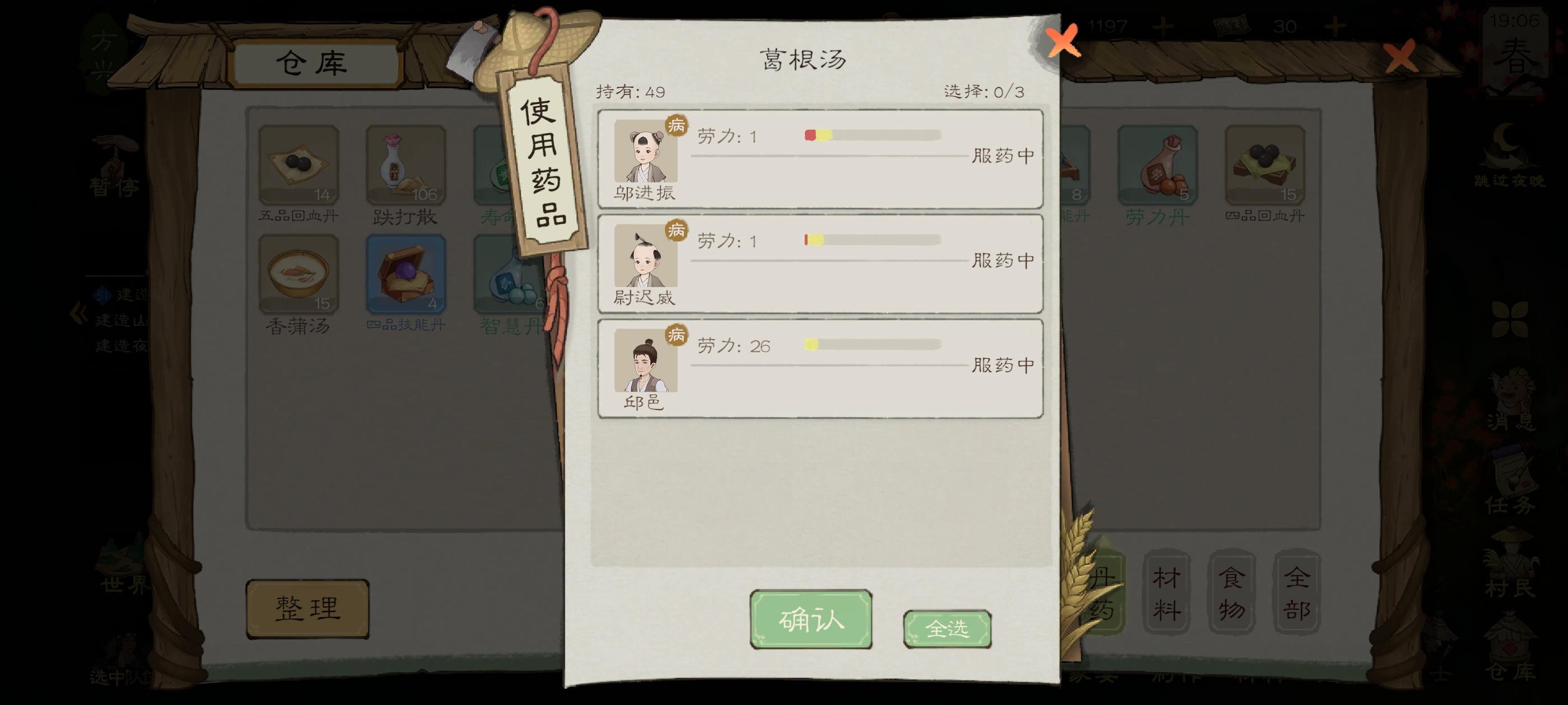做完之后打做完之后打开仓库,点击丹药,给受伤生病的人吃药,疾病条就会慢慢减少,直到归为零