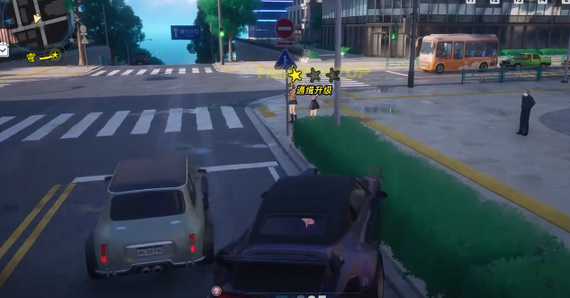 如果玩家在游戏中做出了一些非法行为,例如袭击路人,还有破坏公共设施以及袭击治安官。那么在此时就会积攒通缉的进度,在右上角就可以看到比较详细的标志。而如果等级达到一星时,配备手枪的普通治安官马上就会出动。