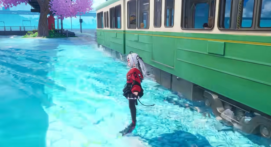 大家可以操作角色站在水边的车站,四周有被轻柔摇曳的樱花树环绕,粉色花瓣随风轻舞,营造出一片浪漫至极的氛围,随着一声清脆的汽笛声,会有一辆设计独特的水上列车缓缓驶来,它的外观融合了复古与未来感,车身流畅如水中游鱼,反射着波光粼粼的水面,画面非常像日式动漫当中的校园场景。