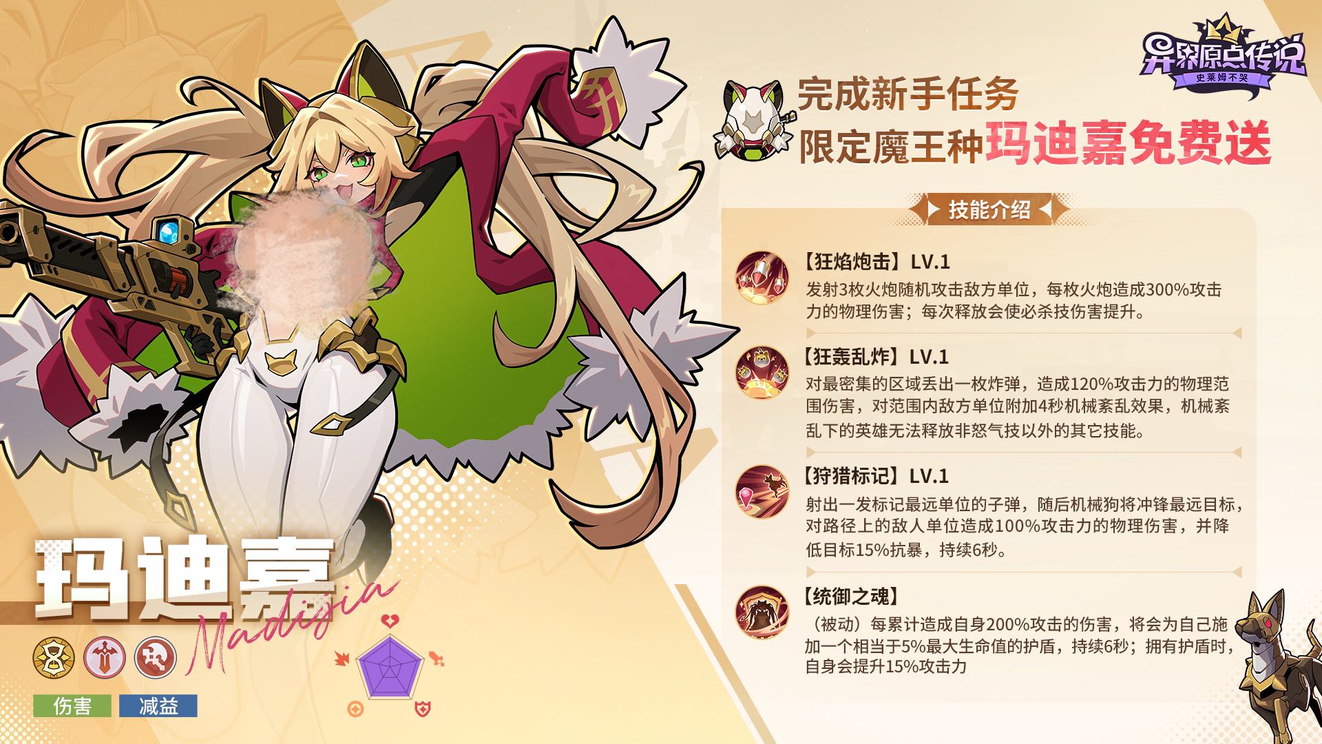 玛迪嘉位置前排,拥有护盾能力,身板不错的SSR战士英雄,拥有范围攻击以及持续叠伤的能力,追求前期阵容全光暗(龙族和深渊)的氪佬可过渡使用,平民可持续追星接下来就由小编给大家带来了详细的《异界原点传说:史莱姆不哭》玛迪嘉配队攻略!