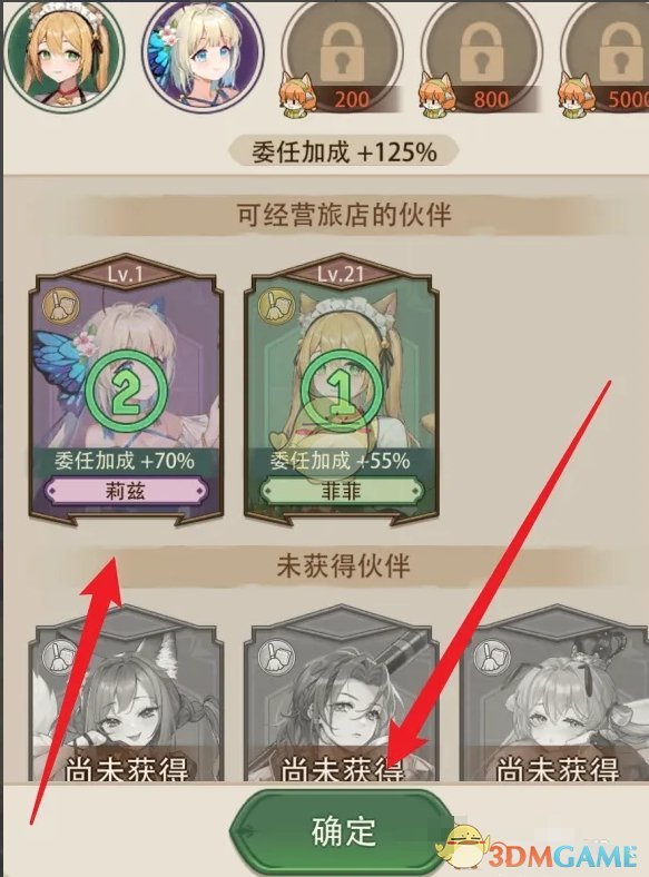 3、最后在可以经营旅店的伙伴选项中,选择已经解锁的伙伴并点击确定,就可以委托伙伴经营。