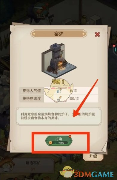 3、在窑炉建造页面,花费100金币点击打造;