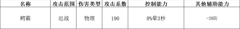 主线副本送一个,可减防,12级后减防能力较为可观,攻击力靠被动可以很高,但没有控制,综合强度较低,开荒可临时过渡用。