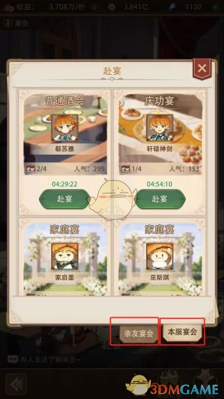 【消耗】每天前4次的1万金币/次相当于白送,后续100钻石/次不限次,消耗特定道具不限次数,每次主人举办宴会需要4人参加才能结算,人满立即结算,否则需要等宴会时间满后才能结算,主人结算是按参与人数进行奖励结算的,所以尽量满座,客人是立即结算的。