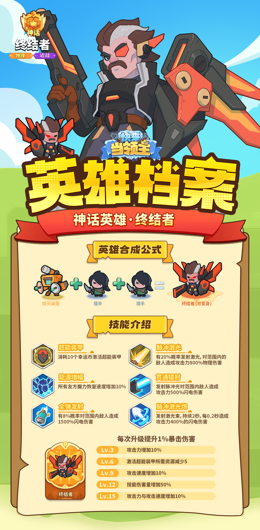 比斯大陆的人族神话英雄『终结者』,激活“超能装甲”变身后战斗力翻倍,攻击方式还会从近攻变成远攻,以凡人之躯,比肩神明!各位萌新领主完成【新兵试炼】任务,就能获得『终结者』哦!下面给大家带来了《快来当领主》终结者技能合成公式分享,需要的可以来看看哦!