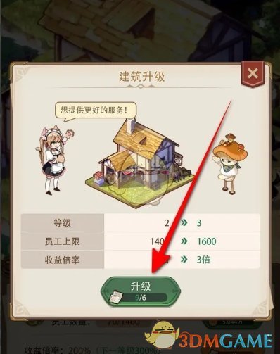 3、在建筑升级页面,花费升级货币,点击升级按钮即可完成建筑的升级。