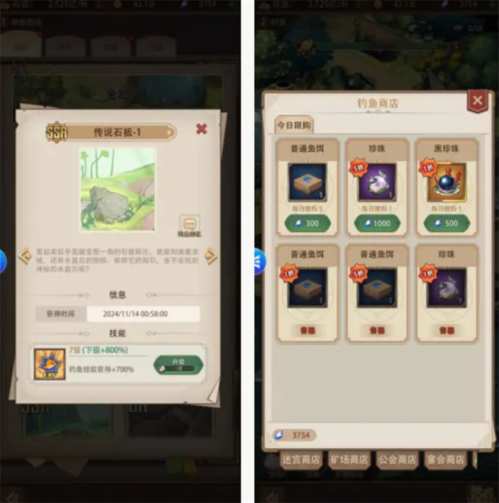 钓鱼:使用传说石板提高钓鱼等级,购买鱼饵提升钓鱼效率。