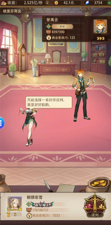 商会:每日通过谈判获得金币。使用战力较高的角色来进行谈判,选择稍高的对手以提高收益。