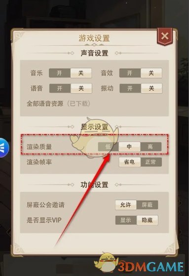 答:在游戏设置页面,找到渲染质量,根据设备的配置来设置低、中、高三个配置。