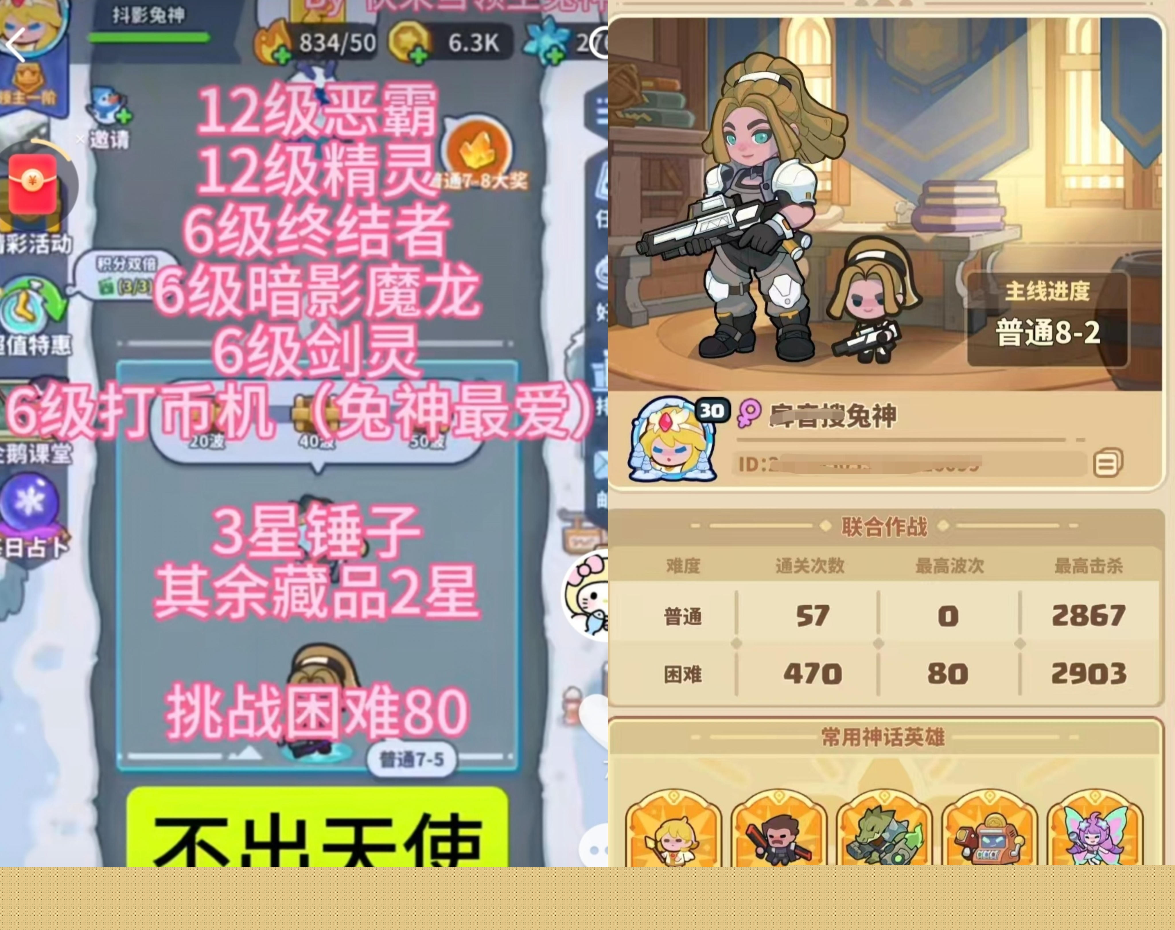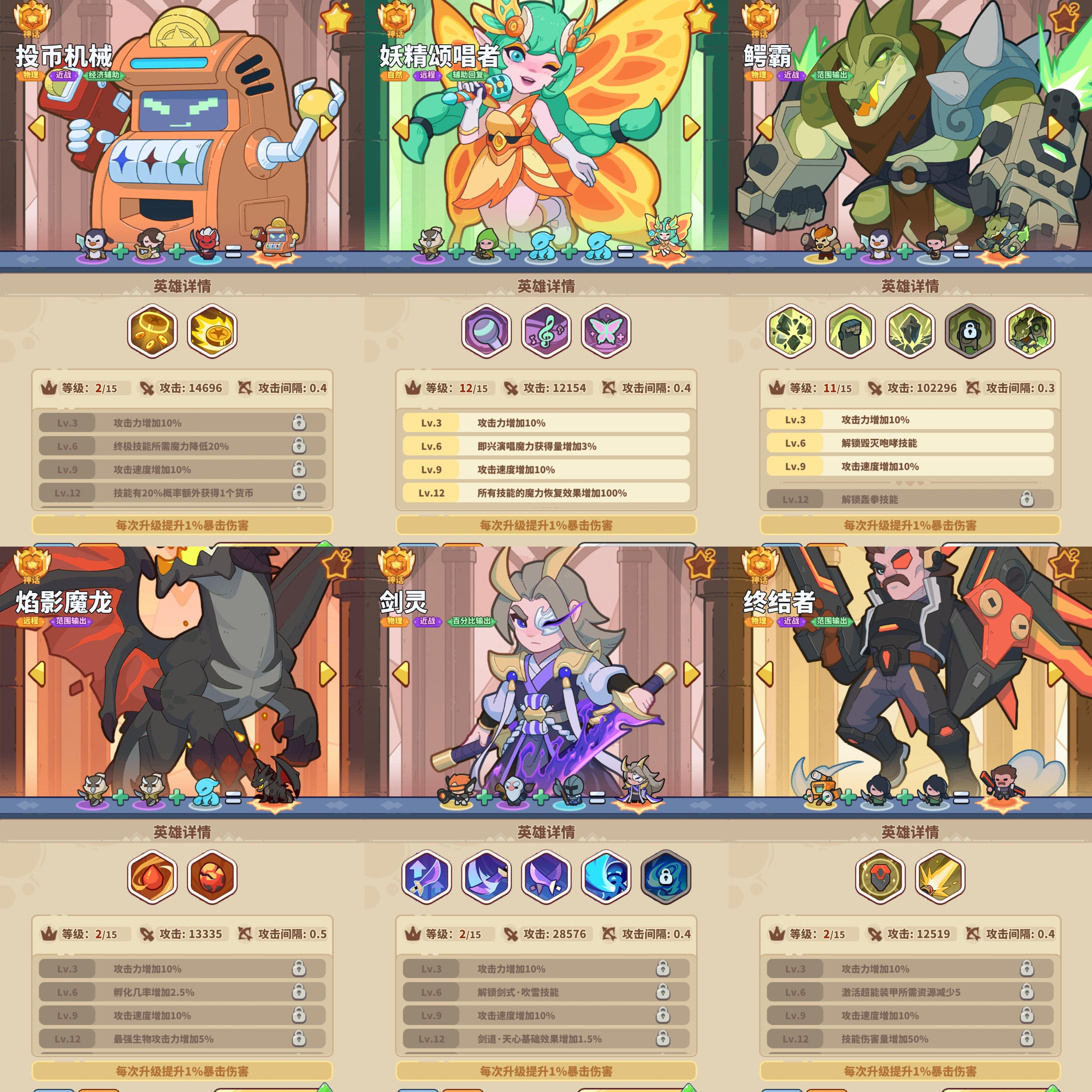 由此看出,这个流派,对于号的强度是有一定要求:最好有12妖精,其他英雄等级如鳄鱼、剑灵、终结者、投币机等最好有6级(不强求天使等级),关键藏品的星级比如保险箱锤子有2星最好。