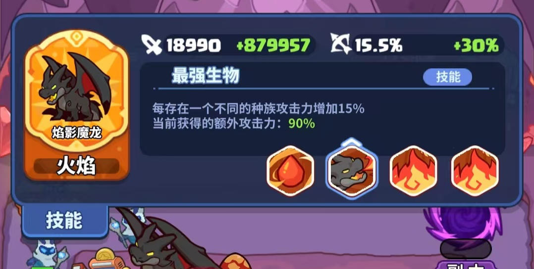 黑龙有个“最强生物”的被动技能,按照“种族”数可加成50%或60%,局外等级12级的龙,“最强生物”的每个“种族”额外增加5%,场内一般变成75或90%,