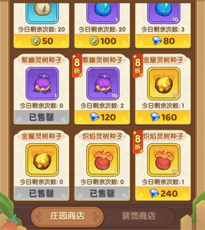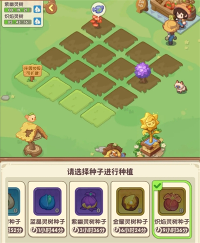 在七级庄园商店便能解锁炽焰种子的购买,其余的种子在前期庄园币不多的时候推荐只买紫幽灵树的种子,它和金耀灵树种子产出的道具几乎一样,只是产出庄园币、经验的数量有差距。