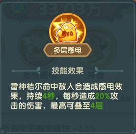 攻击速度:0.56 射程:6格 被动技能: 雷神桔尔在场时,场上雷系植物攻击力+12%,对有护盾的敌人伤害+8%,最多叠至4层