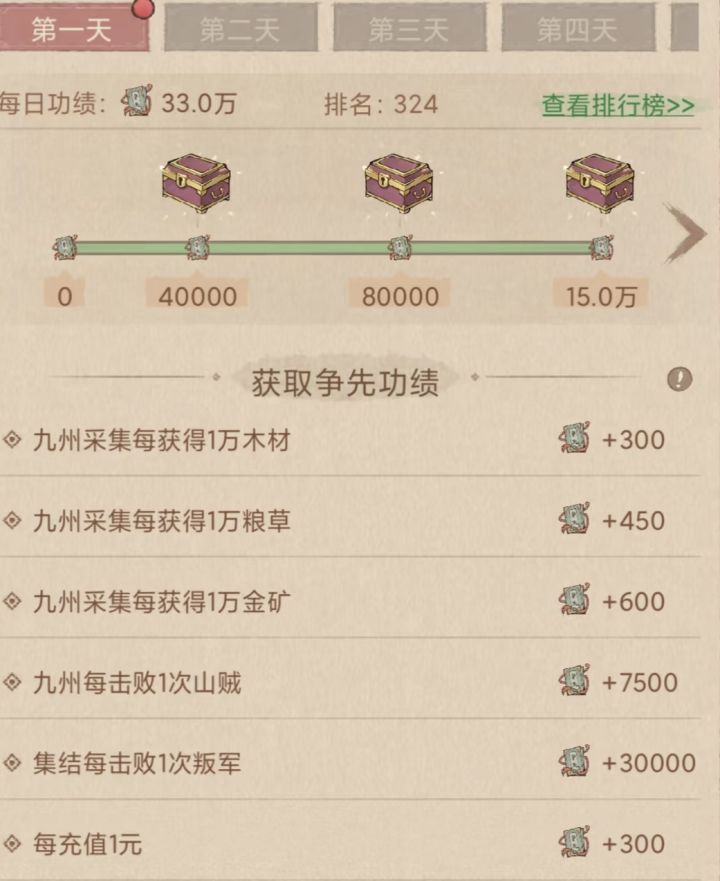 每日主题:采集/打山贼/打叛军→建筑升级/课业升级→升课业/练兵→府兵训练/击杀府兵/治疗(2天) 每日充值