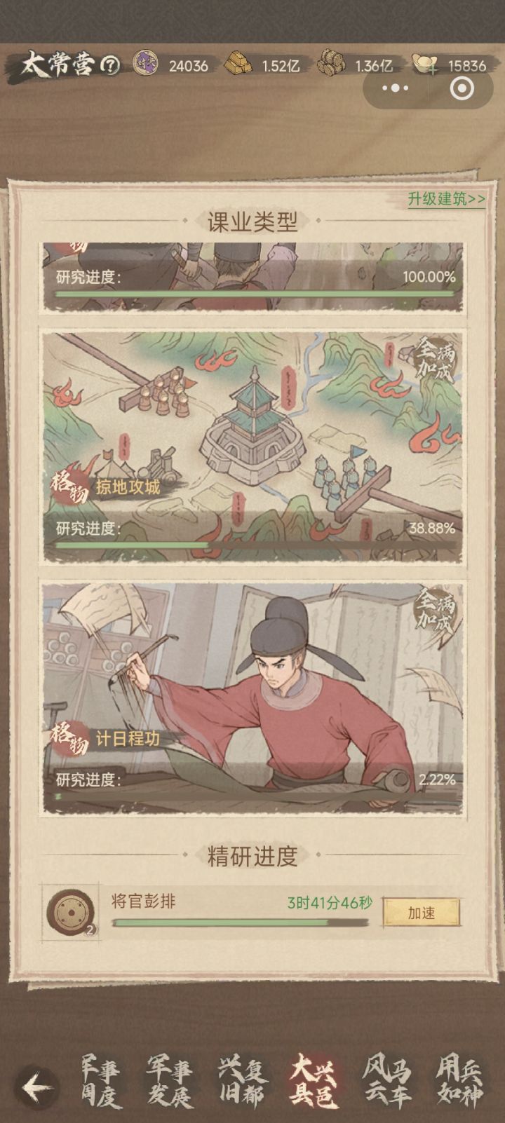 1. 加快建筑升级速度,缩短格物院、太常营等核心建筑的升级耗时,为后续解锁精锐之师等高阶课业、提升戎车实力铺路;