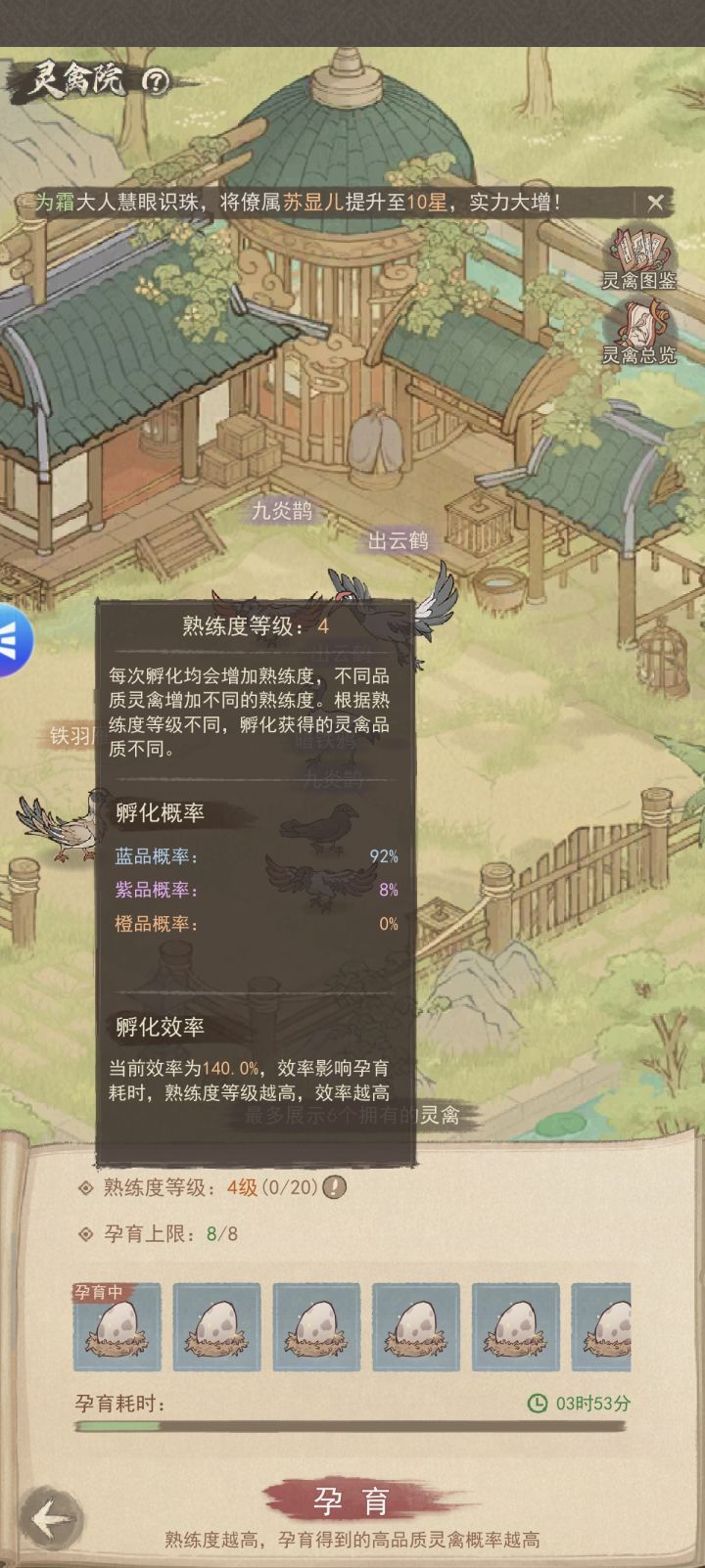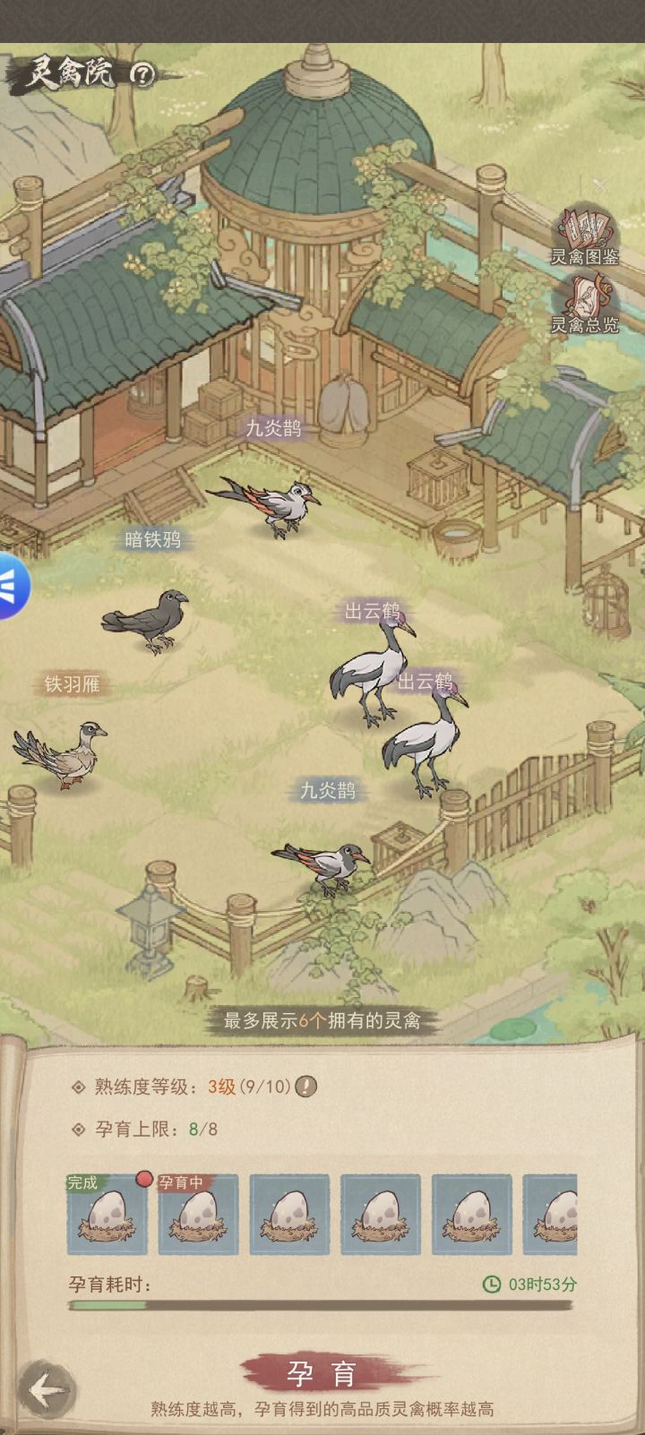培育规则:一次最多养8只灵禽,和养马的上限一样,多养多攒熟练度,