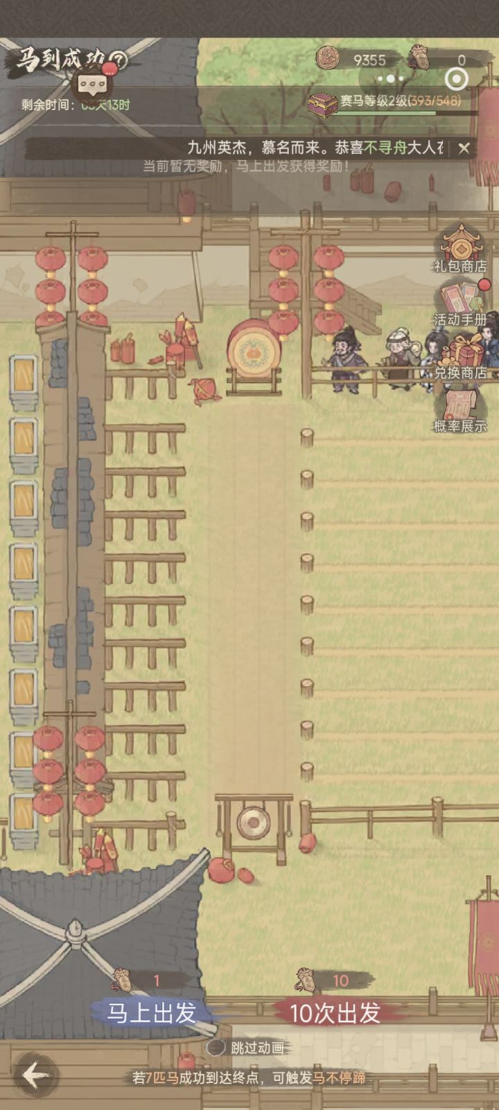 马不停蹄:一轮赛马中,有7匹及以上战马到达终点,直接解锁1次免费出发机会(不用花监牧令);