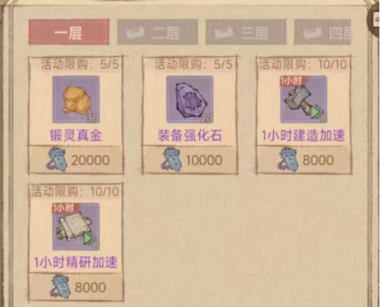 第一层(耗16万):全部兑换“1小时城建加速”和“1小时课业加速”(各80个)。