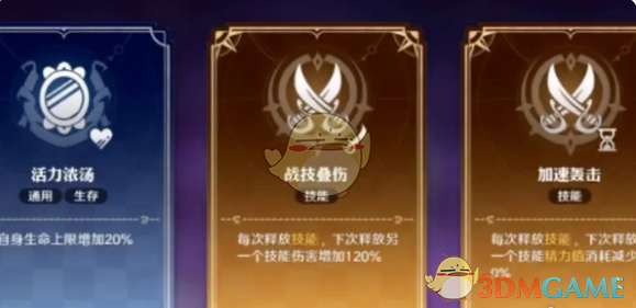 1、技能选择:加速进攻、暴风连击、战技叠伤、加速暴击、活力浓汤