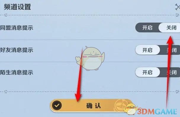 4、也可以点击关闭,然后点击确认即可屏蔽同盟提示消息。