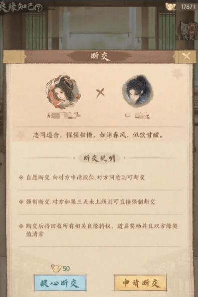 当然,若你与知己的关系走到了尽头,也有简单的解决方式。只需一方在离线超过一定时间,就能发起解除知己关系的请求。如果另一方同意,就能顺利断开。如果不同意,那你就只能花费一些元宝来强制解除。需要注意的是,解除关系后,双方共同提升的等级会清零,所有称号和特权也都会回收,所以在做决定之前,想清楚是不是放弃一段珍贵的伙伴关系。