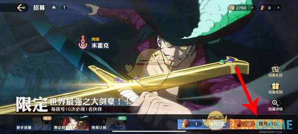 米霍克是航海王壮志雄心游戏内限定的招募伙伴,这个角色的属性是鹰眼剑豪,是一个伤害效果非常强的伙伴,需要通过限定招募卡池获取,招募的概率是根据限定卡池概率而定的,那么角色的具体获得方法是什么呢?接下来就让小编给大家带来《航海王壮志雄心》米霍克获得方法,感兴趣的继续往下看看吧。