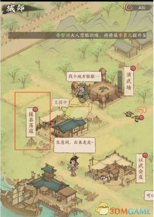 1、访问良田城郊的界面,并点击“支援县城,击退匪寇”的选项。