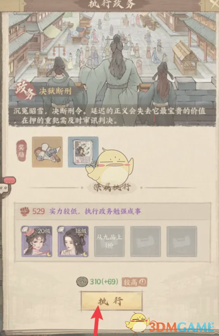2、打开执行政务页面,在下方点击执行图标,即可前往执行决狱断刑任务,选择合适的僚属。