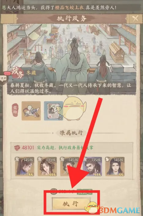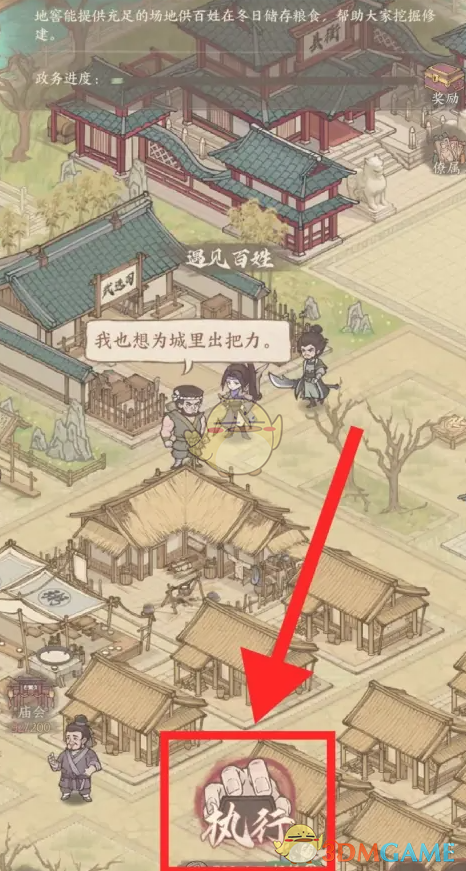 2、进入到执行政务页面,在下方有一个执行按钮,需要选择对应的僚属执行政务。