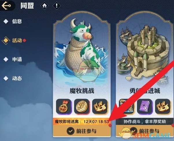 2、接着在同盟玩法内,点击左侧的活动-魔牧挑战;