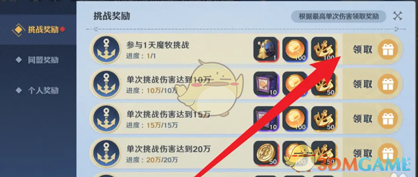 答:同盟-活动-魔牧挑战-领取奖励。
