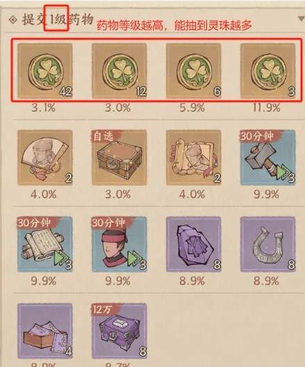 注意:只有紫色和橙色品质的药物提交后,病人的回礼才有概率获取灵株。蓝色品质的药物获取的病人回礼奖池种是没有灵株的。