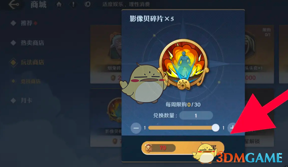 3、选择兑换数量,每周限购30个,售价是70金币可够5个影像贝碎片,点击购买即可。