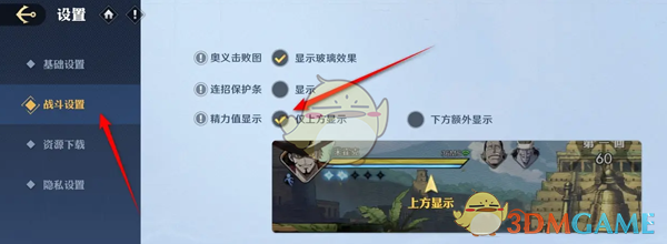 答:在设置页面找到战斗设置,然后选择精力值显示,勾选上方或者下方显示即可。