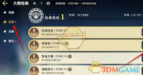 2、在大熊特典页面,点击左侧任务导航栏即可看到多个任务,点击对应的任务去完成并领取奖励。