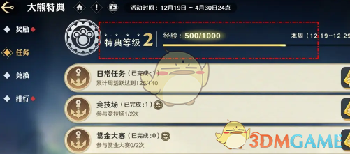 3、任务达成后可获取经验奖励,随着经验的积攒即可提高特典等级,初始等级需要500经验,升至2级则需要积攒1000经验值。